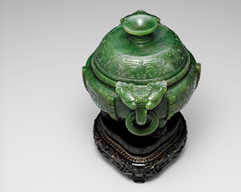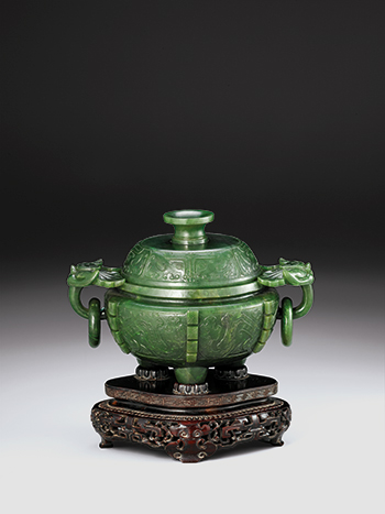 碧玉雕成,玉質姣好呈菠菜綠。器分蓋與爐,蓋做覆碗貌,平頂,頂面雕環形侈口高鈕,蓋壁淺浮雕三組獸面紋。爐廣口,束頸,鼓腹,圜底,下承三短柱足。口緣兩側剔雕一對獸首銜環為耳.,腹壁規整排列六道由四組縱向凸棱所組成的出戟,其中腹壁前後的兩面,利用出戟為中心,形成由雙夔龍所組合的獸面紋。全器具濃郁的商周鼎彝風韻,當是十八世紀復古風潮下的摹古精品。
