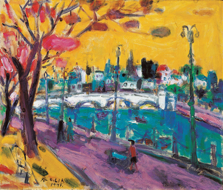 1967年的作品《爱河风景》色彩鲜艳明亮,具有华丽野兽派的味道。画面中黄灿灿的天,蓝蓝的水,凸显南台湾的热带景致;两岸街道是粉红的,添加柔和感,拱桥和路树、街灯,这种造型原则可能受到塞尚的影响。在廖继春的风景图画里没有时间的暗示,而是纯然反映出他对于描绘对象的主观感受。廖继春曾经说过:"我利用简洁强烈的色彩,以对比和强调来赋予更多的色感,同时在线条的构成中注意造型的趣味。不是写某一时间内的印象。"(摘录自林惺岳,《跨越时代鸿沟的彩虹──记廖继春的绘画生涯》,《廖继春画集》, 国泰美术馆,1981,页230-231)他始终用敏锐的眼睛、自在挥洒的巧手,完成充满色彩魔力的愉悦图画。