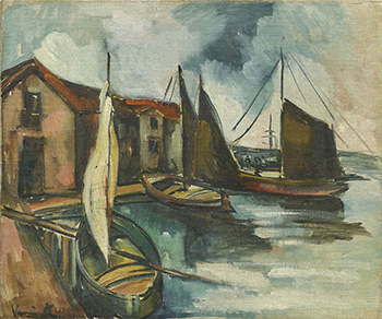 The present lot “Southampton” is a depiction of a harbor city located in the southern part of England, overlooking his hometown, France is 200 kilometers away. Vlaminck moved from Le Seine to the Thames, when faced with different landscapes, Vlaminck was still painting at ease. The composition of the “Southampton” is rich, with three sail boats resting by the harbor, the unsettling float of lines on the sea surface are counterbalanced with the stagnant houses on land. Vlaminck layered dark blue and white strokes as seen in the sky and sea, despite the colors are not as wild as previous years, the rough brush works remained, evenly scattered in the shadows, clouds and the walls. This painting not only represented the mature periods of Vlaminck, it also captured the impressions of Vlaminck as he stood in front of the harbor.