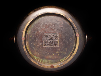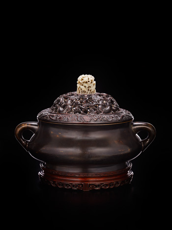 The present lot of a charming censer exhibits qualities of the elegant form and exquisite casting techniques on the bulbous censer found in the Xuande yiqi tupu. The inspiration behind the circular foot, bowl shaped container and looped handles resembles the physical attributes of a bronze gui vessels, which in antiquity were used for offerings of boiled grain. The cover embellished with a combination of the meticulous depiction of four writhing dragons under the intricately worked finial of egrets and blossoms testify to the superb craftsmanship of the present lot. While the cover serves an aesthetic function, it also serves to prevent dust from getting inside the interior, which might taint the fragrance of the incense. The bronze censer of the Xuande reign had been highly sought after by connoisseurs and collectors traditionally for its impeccable quality, as the Xuande emperor had been known to commission the production of various bronze vessels for Imperial altars, offices and halls of the palace after receiving fourteen and five-eighths tons of copper as tribute. Compare with a censer of similar form with a reticulated bronze cover toppled with a jade finial but composed of jade on the body, illustrated in The complete collection of treasures of the palace museum, Jadeware II, Hong Kong, pl.182, p.230. See also another censer of similar form, illustrated in China’s Renaissance in Bronze. The Robert H.Clague Collection of Later Chinese Bronzes, Phoenix Art Museum, 1993, pl.35, p.170-171. Compare with a small censer with a domed-shaped cover similarly surmounted by a delicate jade finial, sold at Sotheby’s Hong Kong, 8 October 2010, lot 2714.