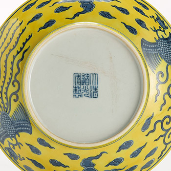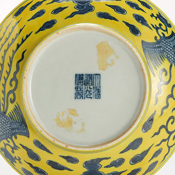 盤敞口,弧腹,圈足。盤內壁近口緣處與盤心外圍各飾兩道青花弦紋,盤心青花弦紋內繪對稱的鸞鳳祥雲紋,其中捲草式尾的為鳳,飄帶尾的為凰。鸞鳳祥雲的留白處滿罩黃釉,腹壁外飾繪鸞鳳祥雲紋,鸞鳳祥雲之外亦滿罩黃釉。圈足內署釉下青花「大清道光年製」三行六字篆書款。