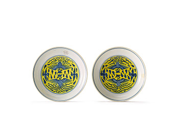 清道光 黃地青花雙鳳紋盤一對