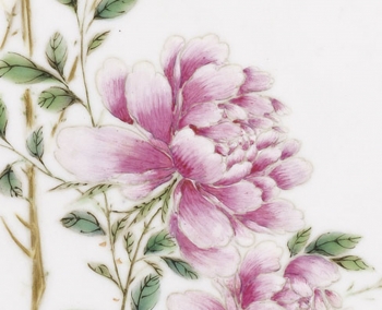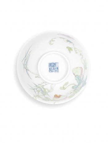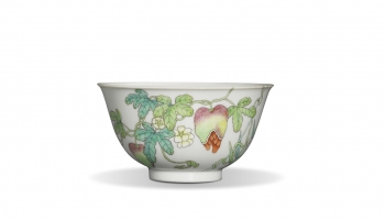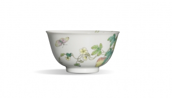 Each with deep rounded sides rising to a slightly everted rim, finely painted in delicate famille rose enamels on the exterior with a flowering vine bearing ripe fruit, one of which with its burst skin revealing red seeds, growing beside bamboo sprays, the branches turning over the lipped rim of the bowl to a continuous pattern in the interior with a fluttering butterfly in flight.