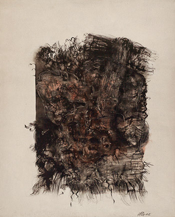 此次呈現的作品《黑線條系列》完成於1995年,不同於山石和半抽象的人體,畫面中的具象元素被抽離,任何可讀的視覺線索全部缺席。黑色和赭色奠定畫面基調。基底的黑色線條整齊排列,由畫面中央向四周擴散,新一層的線條又以整齊的排列從不同方向蓋過。筆刷在畫面迅速劃過,速度與力量的軌跡清晰可辨。畫面的最上層以赭色和黑色顏料做出凹凸肌理。作品並未給出明確的意義指向,不批判,亦不頌揚,只是藝術家在作畫時的自我表達。作品在構圖上與羅芙奧2012年春季拍賣中呈現的另一件周春芽1992年創作的作品《山水精神》有異曲同工之妙。此件《黑線條系列》則在抽象表現主義的運用上走得更遠,更為深入。另外,作品的命名上也預告其意味,作品的名稱往往會給觀者一定的引導,而抽象繪畫往往會規避任何可能的具象指引。正如這件作品便以畫面的內容命名,拒絕任何具象的聯想。觀者只有跟隨線條的律動,遊走畫面之中方可理解畫家作畫時的激情。
