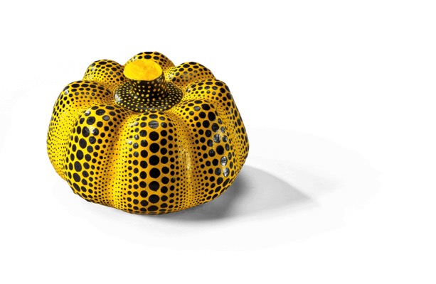 「 當懷裡抱著南瓜時,便會想起遙遠童年時期的回憶。形狀飽滿的南瓜總能撫慰我的心靈,無論當時心裡多麼困苦,都能因此得到安慰。 」 從藝術家的自述,我們能夠得知:由於「南瓜」本身是那麼樣的討 喜、富含能量,每當草間彌生身心備感煎熬時,總可以從繪畫或 捏製南瓜的過程中,得到強大的精神安定感。同時,因為強烈感受 那份來自與藝術家間的精神連結和帶有吉祥寓意的外表,在草間彌 生漫長的創作生涯中,「南瓜」自問世以來,始終是一個深具代表 性、長年受到收藏群所歡迎的重要圖騰。 80至90年代,是草間彌生進行南瓜創作的重要時期,此件形態圓 潤,經由雙手精心捏製、以畫筆排列有序,有著黃底黑色圓點的 《南瓜》立體作品,正是來自於她全心投入創作的年代。「 當我看 到圓點時,眼睛便會閃閃發亮,並且在繪畫的過程中深受感動。」 雖然當時已回到日本的草間彌生已入住療養院好些日子,年逾耳順 之年,然而她旺盛的創作能量絲毫沒眼減退。若我們定神下來仔細 凝視眼前的立體雕塑,那手繪、大小不一的波卡圓點,像是經由縝 密思緒計算般細膩編排,於三度空間中密集、井然有序地不斷地擴 散著;再者,明明全出自於藝術家雙手形塑,且必須經由不可估量 的陶瓷燒製過程,其完成體卻像是由模具製成般呈現左右對稱的完 美模樣。其中,在在蘊含著草間彌生關於精準的創作執念。 「如果不是為了藝術,我應該很早就自殺了。 」因為長年鍾愛的藝 術與出自童年時期的回憶,在精神最為困頓之時,「南瓜」成為拯 救了藝術家生命的重要存在。當我們靜靜地看著南瓜,彷彿真能重 回到草間彌生當下的時空背景,與她因為藝術而得到救贖的一生。