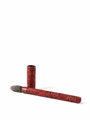 笔身呈圆形,通体髹朱漆,顶部雕团寿纹,笔帽及笔身分布祥云卷曲聚散、疏密迭压,云朵中苍龙若隐若现,围绕笔身盘旋而上,张口吐舌,五爪外扬,昂首翘尾,形貌威风凛凛、强悍威严,方寸之间颇具气势。龙身鬃须鳞爪极为刻画精细,足见功力。漆色纯正润美,髹漆肥厚,云龙纹雕琢纯熟利落,阴刻线条锋芒毕露,整体壮严稳重而不失华丽。