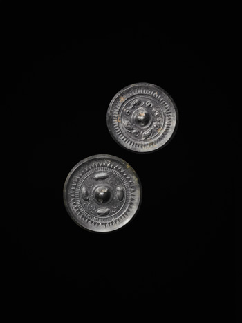 Each with bands of sawtooth patterns on the outer rim and ridges on the outer fields, further encircled by simplistic animals on the inner field below the central knob, the other of circular form similarly decorated.