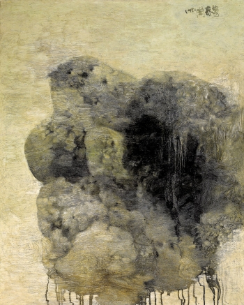 這幅《雲煙山石圖》創作於1990年,正是早期山石系列的代表作。周春芽力圖在方寸畫面間,作品既汲取了中國傳統繪畫的佈局以及注重意境的表現手法,又融入了西方表現主義的濃郁色彩,將西方表現主義和中國傳統文人畫的趣味融會貫通。整幅作品以黃褐色做底、典雅的畫面構圖以及和諧色彩的層層過渡,配合油畫的特殊筆觸和機理,動靜之間,張力互現。在大片的磅礡山石中,透過對質地、肌理的精準掌握和描繪,挖掘出這種有機生命的內在精神靈魂和獨有的美感特徵,籍著表現主義的筆觸堆積出來的肌理質感,運用水墨寫意的流動速度和展現力度,同時將兩種方式在畫面上交互使用著,呈現了作品的畫中有畫的豐富性。