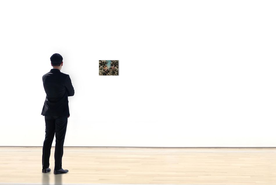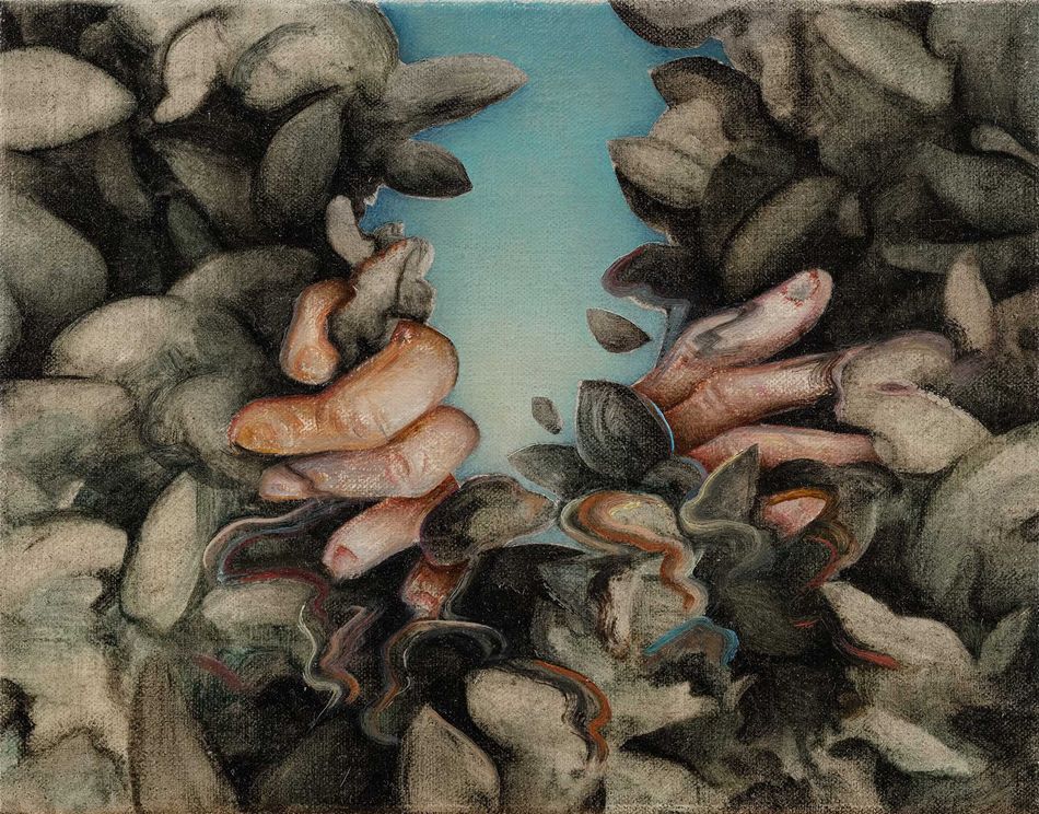 The work "Hide and Seek no.2" presents hands parting through foliage in a small-scaled painting yet it unleashes a burst of instantaneous power within the frame, sublimating it into the purest essence of spiritual attitude.