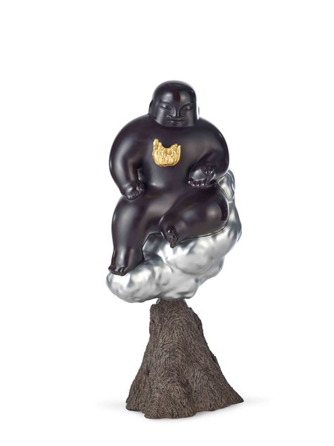 In the “Beacon” series, Li Chen portrays the lighting of a lamp as a kind of rejuvenating repose that contains the subtle joy of a simple ceremony. Between us and the light a sense of romance emerges from the slow dance of the candle’s flame that allows the mind to settle, giving us an opportunity to begin a dialogue within ourselves. Li Chen utilizes the Buddhist concept of emptiness and the Daoist concept of “Qi” in combination with modern language to blend the abstract with the concrete and create a figure that is gentle and lively while preserving its meditative stillness.The piece, “Fire Master” is centered around a timeless spirit whose peaceful and auspicious visage is defined by the upturned corners of its mouth. It’s leisurely posture appears peaceful and comfortable reclined within a cloud perched upon a mountaintop. In front of its chest is a flame that it manipulates as if to refine or in play, reminiscent of the fire brought by Suiren. The warmth within the dance of the flame’s light is filled with life and successfully recalls a never-ending cycle of breath, filled with peace, wisdom and good fortune. Like a light appearing after a thousand years of darkness, the swaying glimmer of the flame casts the figure in both light and shadow in a wise and serene style inspired by yingze and gilded by light.