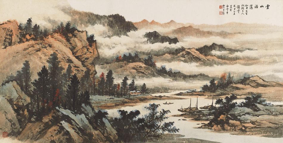 黄君璧因家中收藏古代名迹甚为丰富,其习画多临仿古画,早年喜爱渐江笔意、中年仰慕夏圭墨迹,又因其着重写生,要求作画须有外师造化的功力才能习得心源之先,张大千更曾赞其山水能「独善其秘」。此作《云山浩荡》是带有石蹊一脉笔意盎然的写景经典大作,以铁线钩及褶带皴描出主山形廓,布局严谨、结构有序,由左至右、由密至疏地将碧山迭峦、林树屋舍、溪河舟帆乃至于远处的连绵山脉及烟云融为一体,景深依序罗列且层层相扣,颇有尽揽广袤天地入眼底的气势。黄君璧用笔设色典雅细致,画林树青润葱郁,写白云烟岚浮动之貌更显轻盈;全图构图平稳和谐,笔到之处无不用心经营,密林幽谷被氤氲的水气所笼罩,似有凉风扑面而来,远方山景迎光,彷佛景色无限延伸观之不尽。曲折围绕的江水可见出一河两岸的布局,舟人摆渡与行船停泊呈现出一动一静之间的生机,对岸掩映的房舍呈现出闲逸朴实的气韵,细品观之能更得其云山自在的画意。