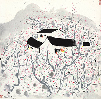 吴冠中受过西方现代艺术洗礼,且深研中国书法水墨精髓,融合东西美学却不受其所制,提炼成为独特清雅的画风。1980年代后,吴冠中对墨色的驾驭更臻炉火纯青,此时他在单纯的黑白水墨画里渐渐添加上颜色,而多了缤纷活泼的风貌。1983年的《红梅》展现了艺术家出神入化的笔墨功力,浓淡之间、不同笔法的转折共同谱出引人入胜的世外之境,特别是淡墨勾勒出梅树,笔锋流畅奔放,尽显梅树坚韧劲拔的精神,一方面充满东方书法精神,另一方面,疏密有致的树干与红梅、绿芽交织出点、线、面的旋律,展现了抽象表现的意趣。吴冠中出生于江苏宜兴,学习成长于江南,对此地有着深刻的情感,近三十岁赴法国进修数年后回到中国,虽然往后大半生都居住在北京,但江南永远是他生命里的原乡,也是其艺术创作生涯中不断描绘的主题。此幅《红梅》即以艺术家心目中的江南山水为原型,而经历风雪寒霜的梅花正如吴冠中的傲然风骨,他走过了大时代的动荡,无论身处困顿或受人追捧,总是一本初衷,执着于对艺术的追寻与开创,终致成就无可取代的大师地位。